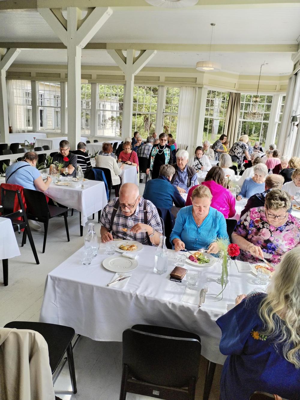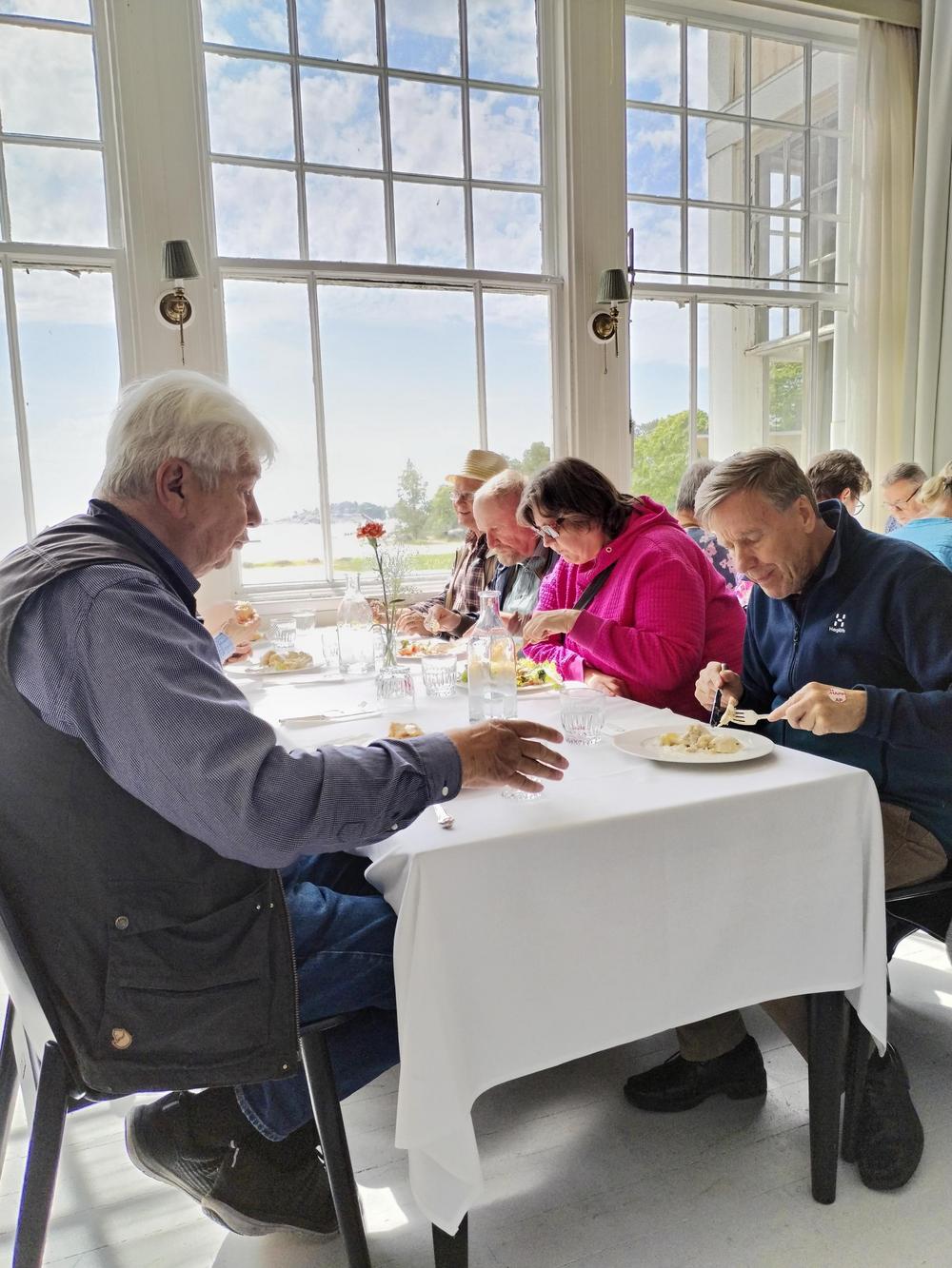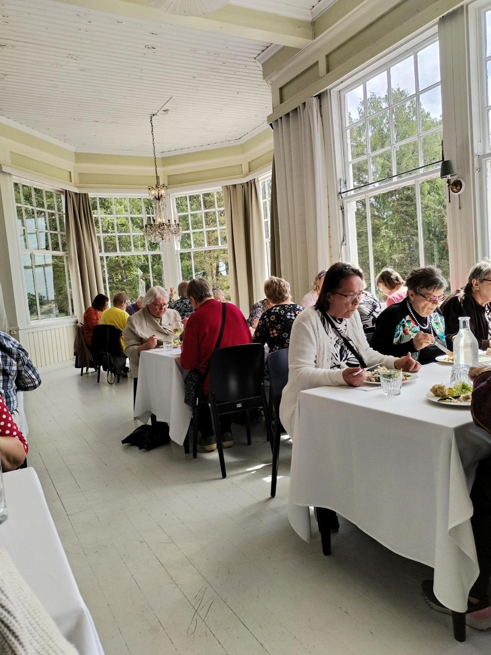 Bussi lähti taas liikkeelle kohti uusia seikkailuja ja kohti Suomen mantereen eteläisintä paikkaa Hankoa. Opas Leena Immonen oli bussissa mukana ja johdatti meidät ruokailemaan Hangon Casinolle. Lounas oli monipuolinen ja herkullinen. Ryhmäkuvaan saimme meidän koko porukan, noin 50 henkeä.