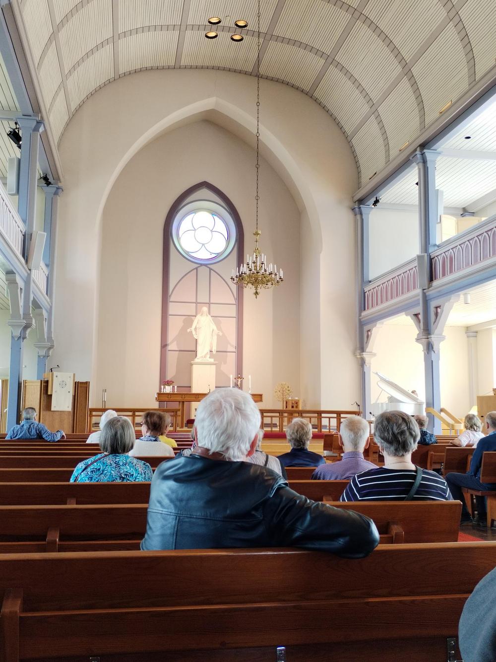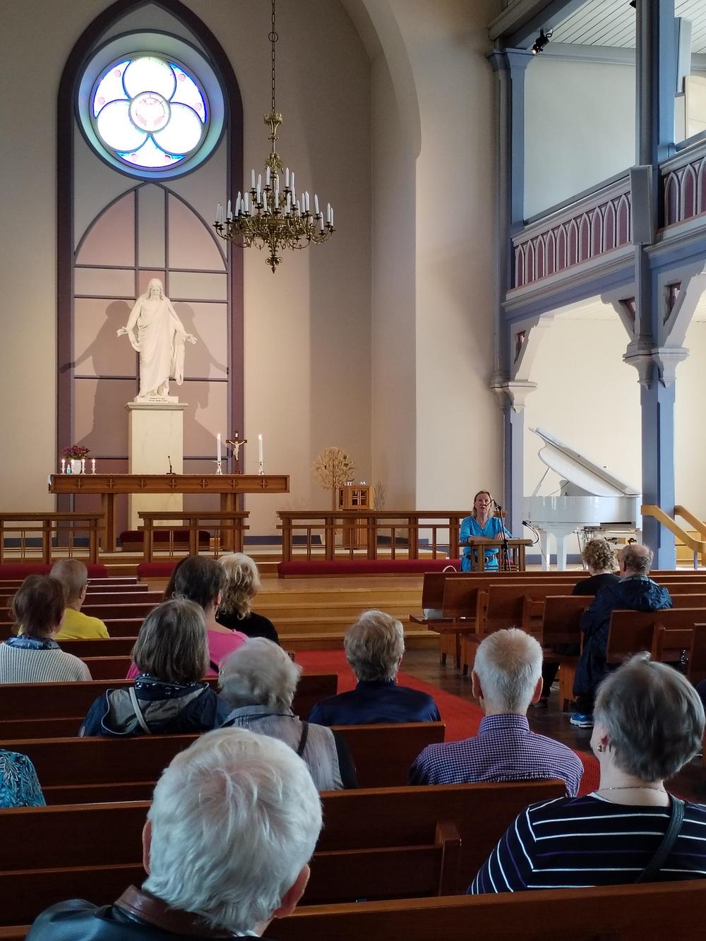 Kävimme tutustumassa Hangon kirkkoon, jossa saimme myös pienimuotoisen kirkkokonsertin oppaamme soittamana