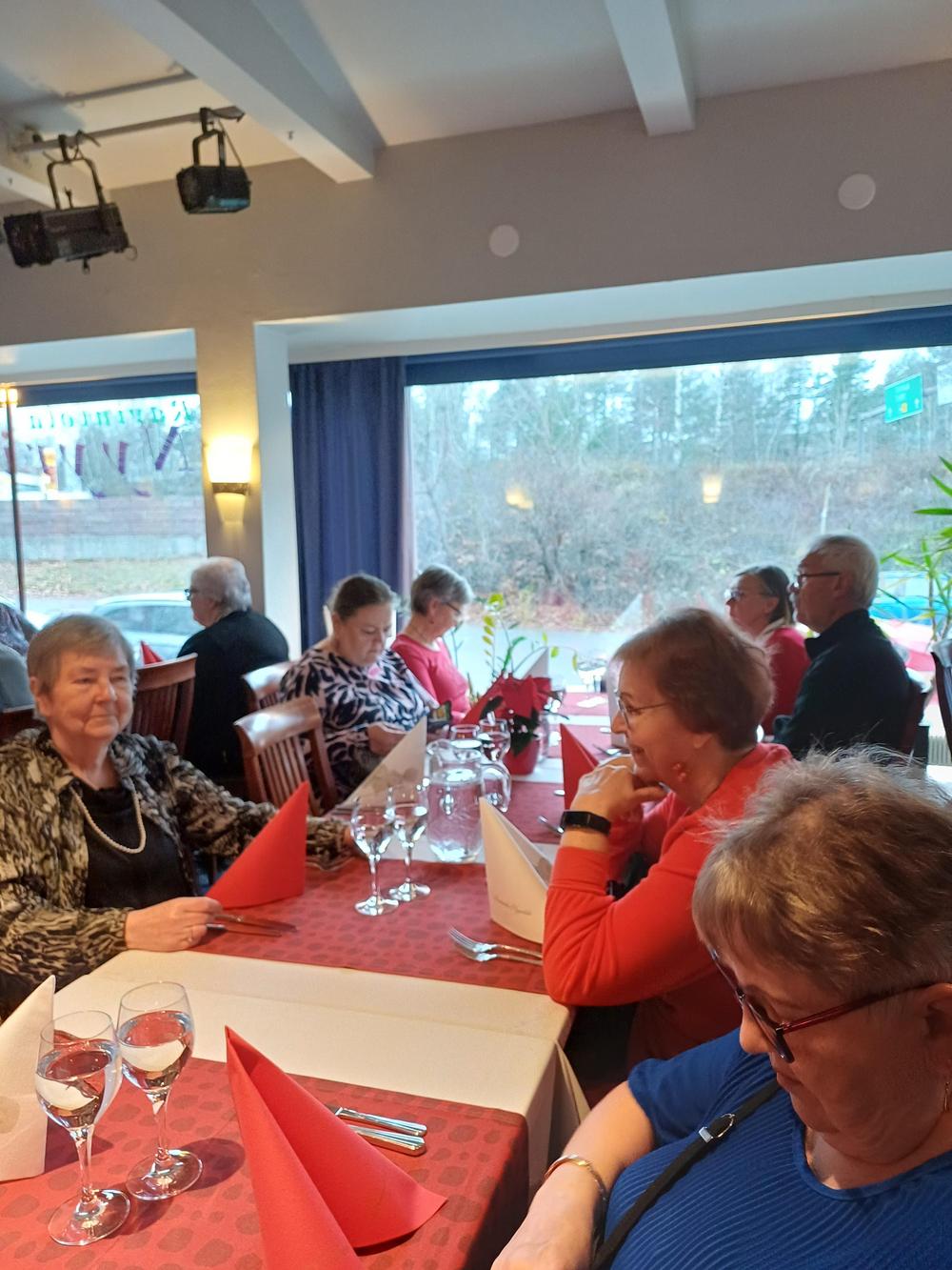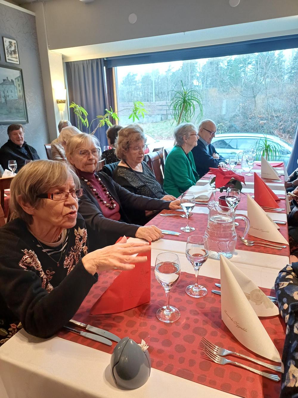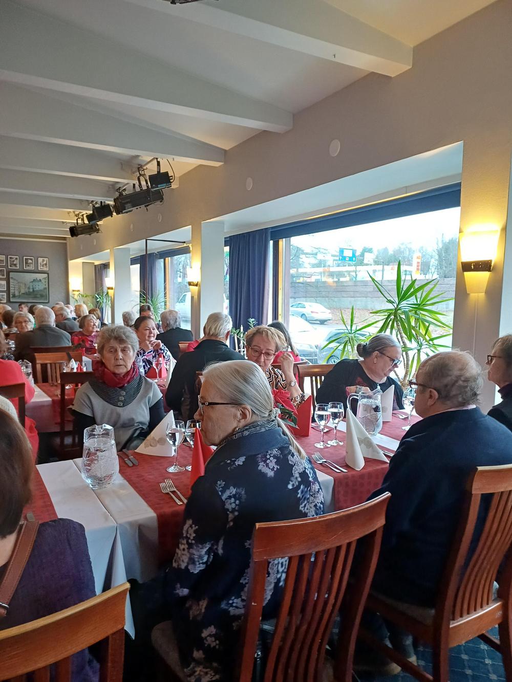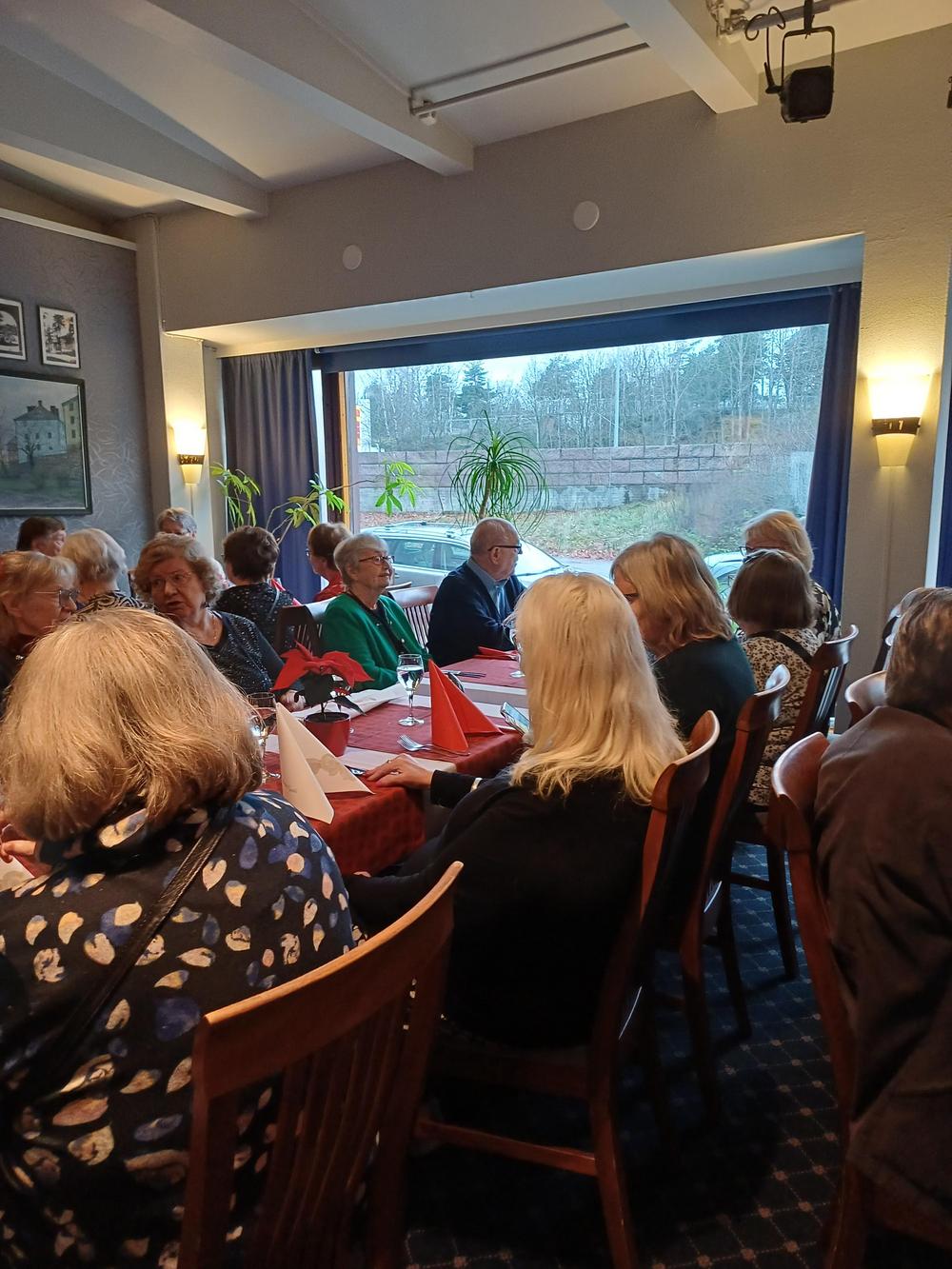 Jouluruokailumme oli teatteriravintola Nyyrikissä, Käpylässä. Oli lohta,silliä,rosollia ym. ja kinkkua,kalkkunaa ja laatikoita. Torttukahvit jälkiruuaksi.Hengenravinnoksi Eeva Rantinojan monologi,runo-ja lauluesitys "Aikamatka menneisyyteen" Kyllä minä muistan... Ravintola oli melkein täysi,kun meitä ruokailijoita oli yli 60.
