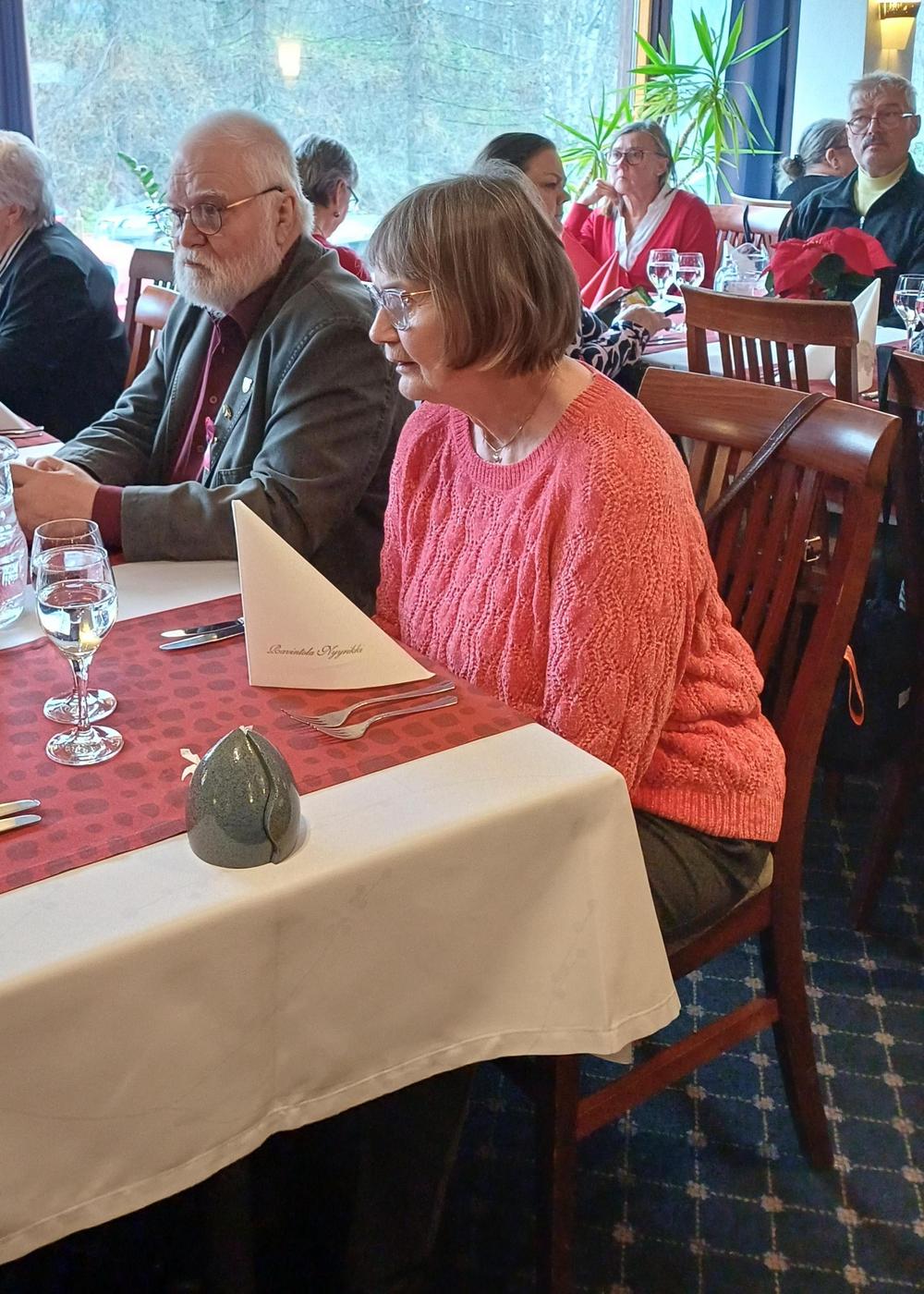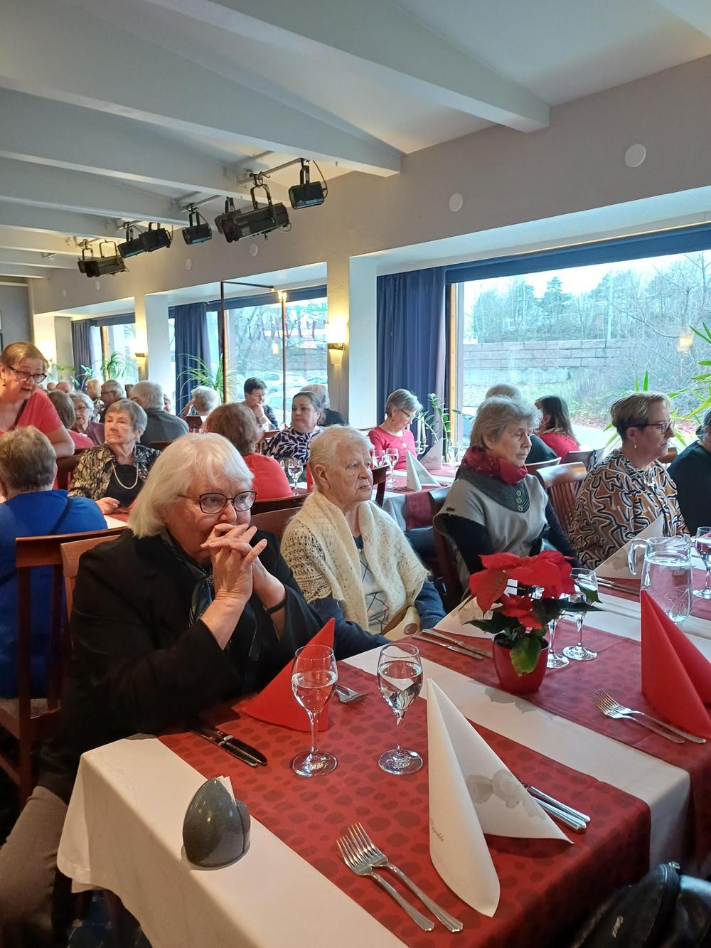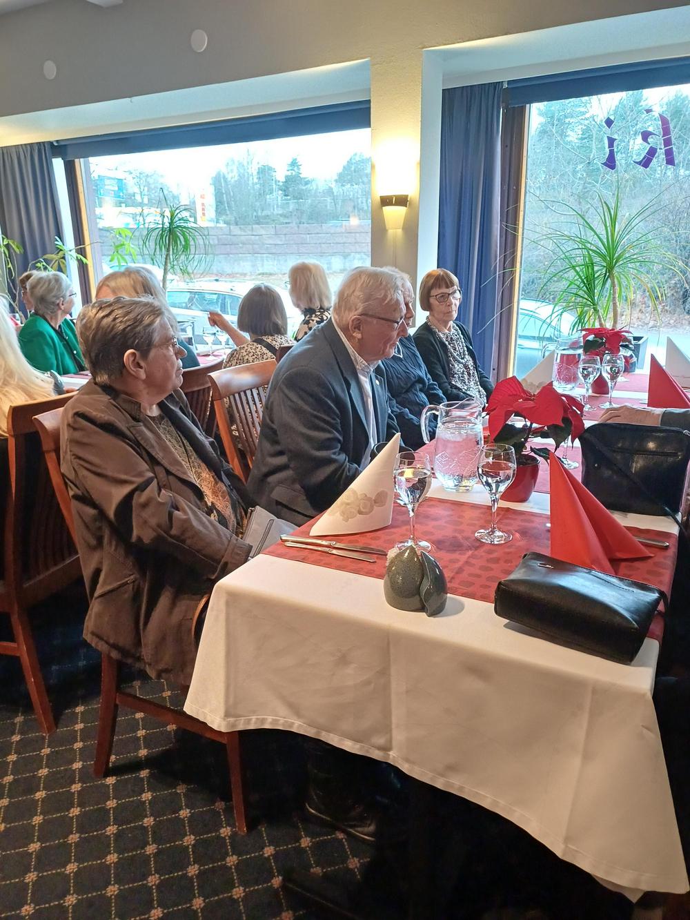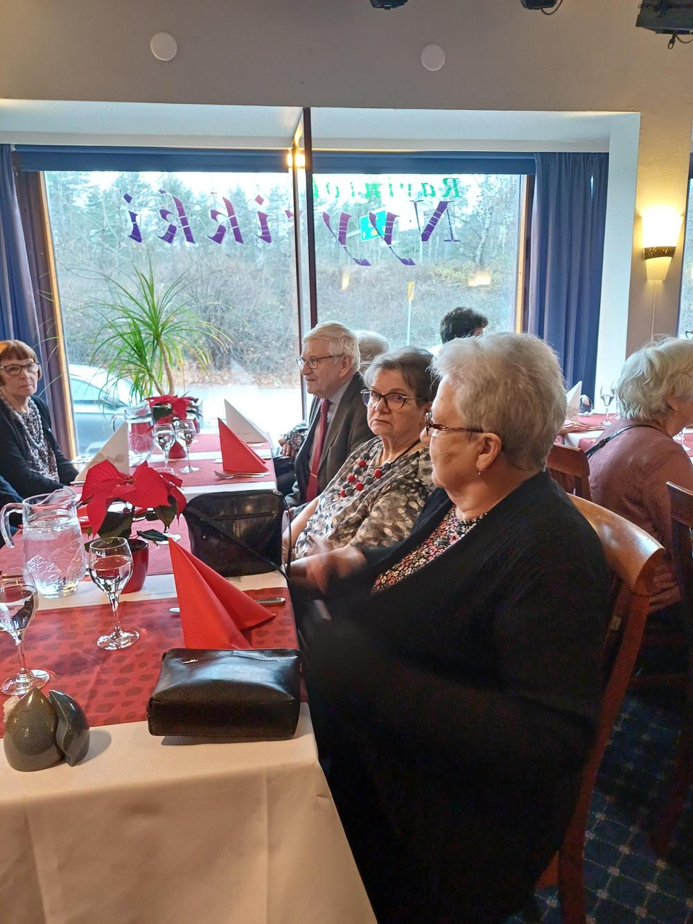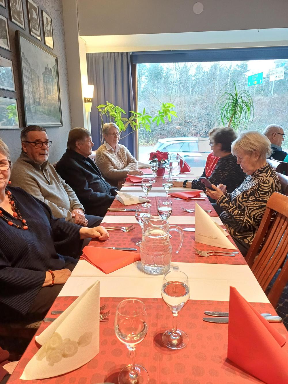 Jouluruokailumme oli teatteriravintola Nyyrikissä, Käpylässä. Oli lohta,silliä,rosollia ym. ja kinkkua,kalkkunaa ja laatikoita. Torttukahvit jälkiruuaksi.Hengenravinnoksi Eeva Rantinojan monologi,runo-ja lauluesitys "Aikamatka menneisyyteen" Kyllä minä muistan... Ravintola oli melkein täysi,kun meitä ruokailijoita oli yli 60.