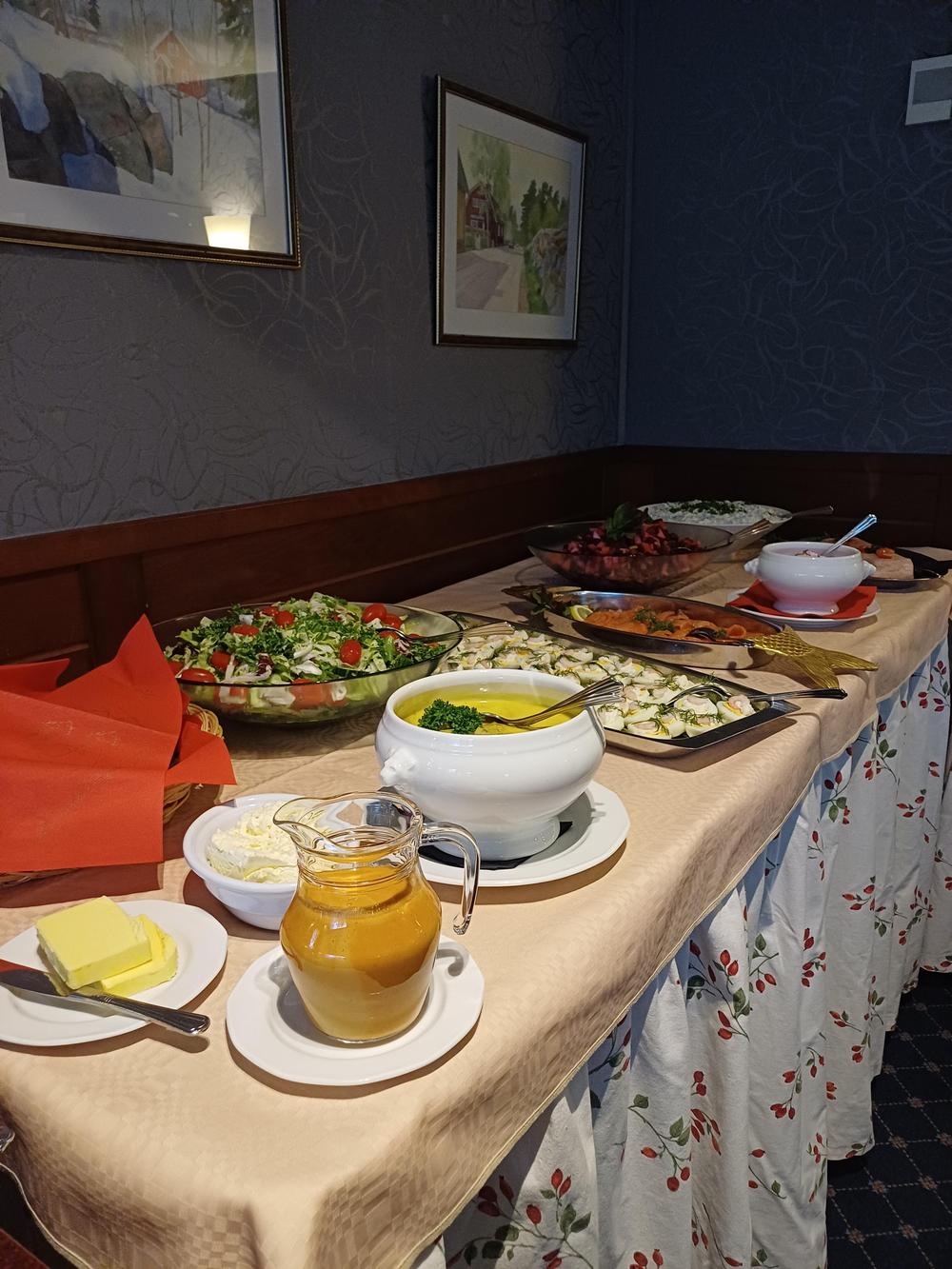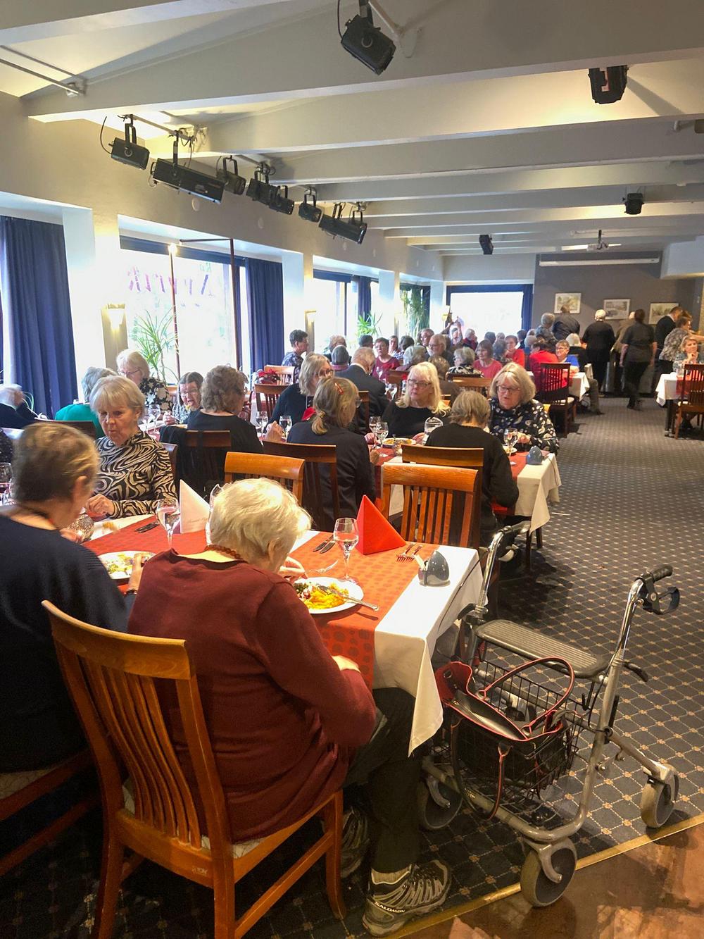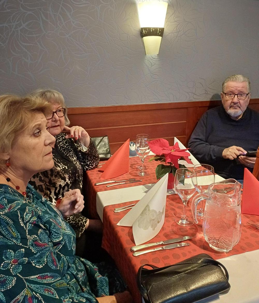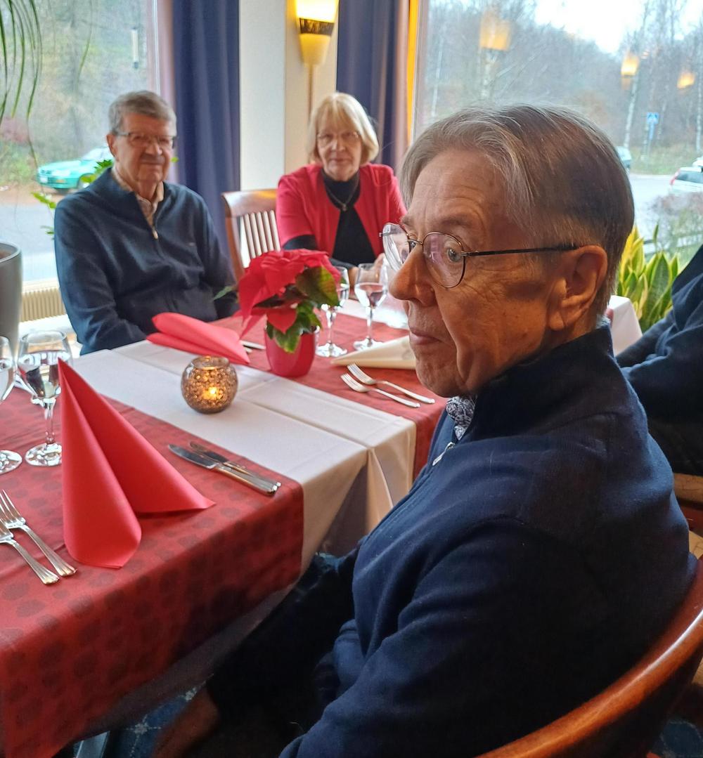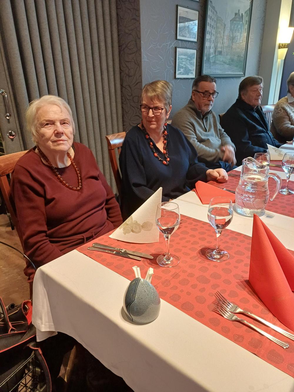 Jouluruokailumme oli teatteriravintola Nyyrikissä, Käpylässä. Oli lohta,silliä,rosollia ym. ja kinkkua,kalkkunaa ja laatikoita. Torttukahvit jälkiruuaksi.Hengenravinnoksi Eeva Rantinojan monologi,runo-ja lauluesitys "Aikamatka menneisyyteen" Kyllä minä muistan... Ravintola oli melkein täysi,kun meitä ruokailijoita oli yli 60.