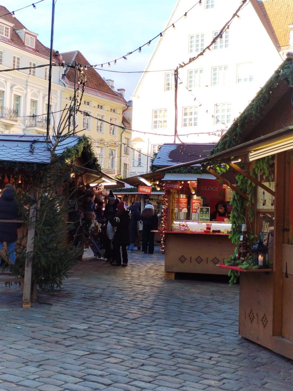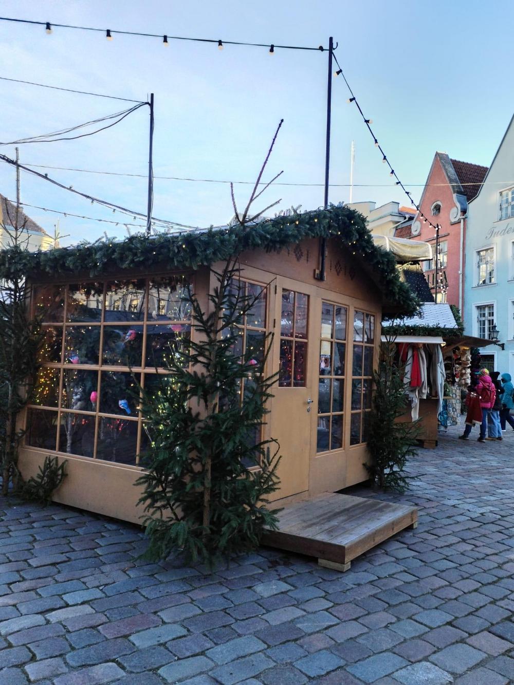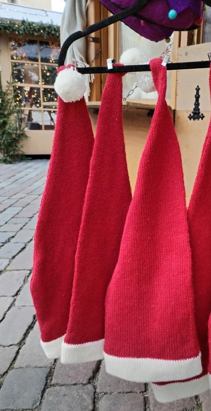 Erilaisia havukransseja ja kudottuja tonttumyssyjä Tallinnnan joulutorilla